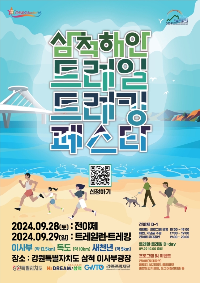 삼척 해안 트레일·트레킹 페스타' 행사가 오는 28∼29일 강원 삼척시 이사부광장 일원에서 열린다. 이번 행사는 이사부 독도 평화의 다리와 연계해 동해안 최대 해안 절경을 자랑하는 이사부길을 주 코스로 새천년코스 5㎞, 독도코스 10㎞, 이사부코스 13.5㎞ 등 총 3개의 트레킹 코스에서 진행된다. 참가 신청은 홈페이지(...